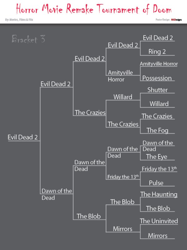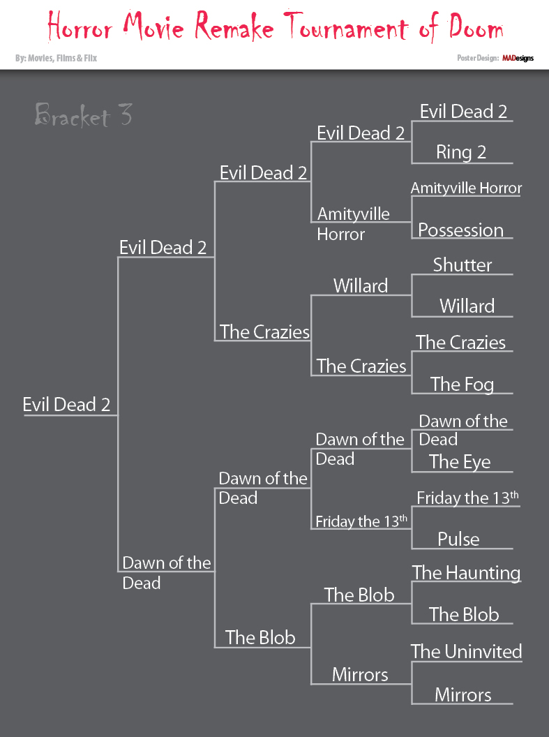 We hope you haven’t missed anything yet. So be sure to check out the last two brackets (click here and here) and the initial tournament breakdown. And don’t forget you can use this cinematic kumite to mediate arguments on which movie to rent on Halloween. Just consult the brackets, assess the strength of schedule, and then bitch that there’s no play-off system–just like NCAA Division-I football!