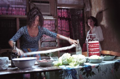[Like an Asian Julia Childs, Bai Ling works the dumpling dough]