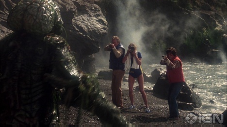 Our “let’s investigate”-minded protagonists discover the breeding ground and lair of these creatures.  They clearly never played a zombie FPS because they’re aiming their shotguns for body shots and the creatures’ heads have over-sized exposed brains.  Really, guys?  How did you miss that?  While they fumble about trying to eradicate these abominations we learn that the somewhat-attractive, 6-foot blonde, marine biologist (Ann Turkel of Deep Space(1988)) accompanying them seems far too knowledgeable about this allegedly unknown species.  It turns out that her super-funded company was responsible for accidently creating these awful mutant, hyper-evolved sardinious killers.  Who’d of thought that a big company would be responsible for such horror (Alien’s Weyland Industries; Resident Evil’s Umbrella Corporation; Jurassic Park’s InGen; Terminator’s SkyNet)?