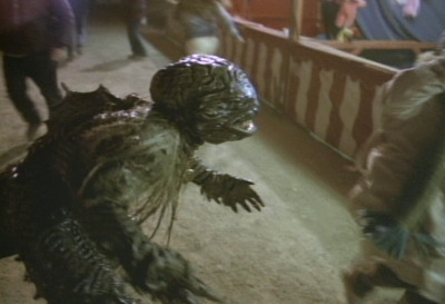 Our heroes’ coup de grace comes when they light a 50×100’ area of water surface on fire with gasoline.  Somehow this helps the festival attendees to successfully thwart this brood of gilled villains.  Of course!  Because if I was a fish-man I’d become physically weaker if within ten yards of fire and, were I under water, I’d surely surface, catch fire, and remain at the surface so that I could burn to death slowly.  REALLY?