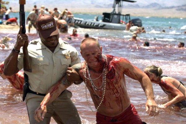 Quite a cast: Richard Dreyfuss, Ving Rhames, Elisabeth Shue, Christopher Lloyd, Jerry O’Connell, Adam Scott, Dina Meyer, Scream Queen Kelly Brook and a cameo by Eli Roth. Was it worth it? I think so! This remake (which is at least as fun as the original) kicks off like Girls Gone Wild: Spring Break, foreshadowing gratuitous nudity for teenagers with Netflix across the globe. Appropriately, Jerry O’Connell plays the “Wild, Wild Girls” director/producer who goes to a small, Spring Break-friendly lake town in the Southwest to make his fortune. Meanwhile Elisabeth Shue and Ving Rhames play local cops trying to keep Spring Break order. Good luck.