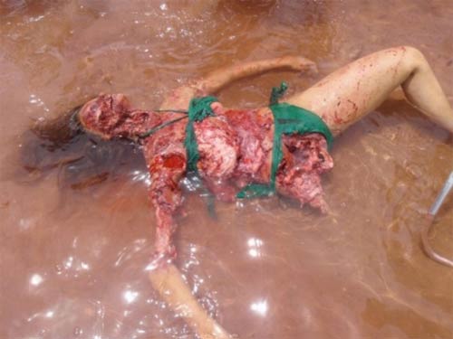 The CGI attacks are fun and better than any made-for-ScyFy Saturday night movies. The kill-humor is 80’s-chic and includes eyeballs being tugged from their sockets. Some other kill-innovations include clever boat collisions, high tension wires, a girl getting scalped by a boat engine propeller, and a fish eating its way out of a person’s mouth. Breast implants, a severed penis and disembodied eyeballs drift about in the tidal chaos as well. Oh, and a piranha eats and then belches out a dick, there are lots of “halves” of people, one woman is “accidently” torn in half by her rescuers, and a dude walks on his bone foot. Nothing but fun, folks!!! I’m giving you pearls here!