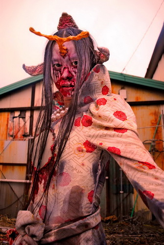 And here’s mommy Eihi after her space-zombie makeover! She’s been outfitted with some lovely pearls, a demon starfish head-cap, and a rubber horn shaped like an old TV antennae.