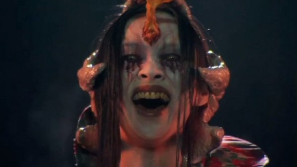This entrail-rich gem is typical of the genre. There are lots of arterial sprays unleashing floods of blood beyond reasonable human body’s capacity, detonating body parts, dismemberment galore and, of course, Kika’s backstory. As a young girl Kika came home to find her crazy bitch mother (Eihi Shiina) and her Japanese punk-redneck uncle in the middle of making sushi out of her father’s legs—in front of him with his legs flesh-picked knee down. Out of nowhere a meteor strikes the bloodlusted bitch “through” her chest. So naturally, she rips out Kika’s heart and uses it as her own. Then she turns into some space-zombiism typhoid Mary and plagues Japan faster than in 28 Days Later. She is then entombed in some hardened mucus cocoon, from which she emerges as the hive-mother space zombie queen. Meanwhile, a public figure from a secret government agency stitched up Kika and outfitted her like a samurai-ninjette with a lawnmower engine in her chest so that she could control infected populations.