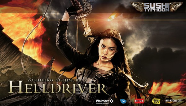 Director Yoshihiro Nishimua (Vampire Girl vs Frankenstien Girl (2009); Mutant Girl Squad (2010)) learned a lot from writing/directing Tokyo Gore Police (2008). For example, everyone loves Eihi Shiina (Vampire Girl vs Frankenstien Girl (2009); Tokyo Gore Police (2008); Audition (1999)) and chainsaw fights are cool! Other nifty additions to this gore flick include an assaulting hail of zombie heads, a zombie miscarriage, a zombie dance party, a zombie head crotch bite, a chainsaw-sword up the tush, a car made out of body parts, and a 50’ tall zombie made out of other zombies that then turns into a giant zombie 747. The fights are most interesting mid-movie. The zombie baby, attached by the umbilical cord to zomb-mom, is used as a whip-dagger-harpoon. There’s a zombie with katanas “growing” out of it that has a sword fight with a bladed car. And there’s an eight-limbed, sword-spider-zombie nude acrobat chick with baby arm-tusks and a crotch hand. Say what? She’s probably my favorite.