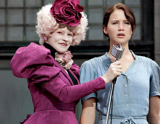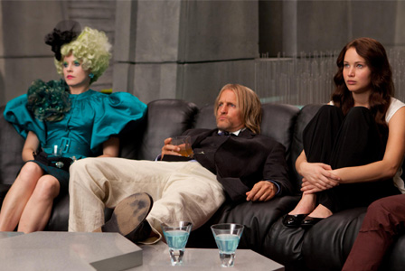 Stanley Tucci, with highlighted Victorian hair as ridiculous as The Fifth Element’s opera scene boasted, rises above his silly outfit to perform fantastically as the event’s ongoing emcee. And Wes Bentley (Gone; Ghost Rider) looks ridiculously diabolical with weird facial hair and vest suits, as the promoter and director of the event. Even more strangely wardrobed is the villainous Elizabeth Banks (Our Idiot Brother; The Next Three Days), a striking purple and powdered pale menace to high society who acts as if the chosen tributes are to be congratulated for their participation. Woody Harrelson (Friends with Benefits, Rampart), who I normally love, is rather unimpressive as their hesitant, alcoholic mentor and previous Hunger Games victor. He explains that the best means of survival (i.e., food and shelter) is to get people to like you; to have sponsors.