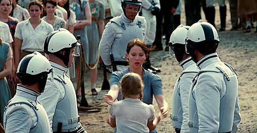 At The Reaping ceremony their worst nightmare comes true when Prim’s name is drawn. To spare her young, innocent sister, Katniss volunteers as District 12’s tribute in her stead. It was during this scene that I realized this movie was suited for adults and not just the young adult readership of the books. The scene was tactful and, emotionally, felt very real. Katniss is nothing if not credibly heroic; motherly, protective, brave and altruistic. After being chosen she shows no fear for anything but the future well-being of Prim and their emotionally vacant, widowed mother.