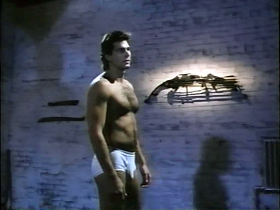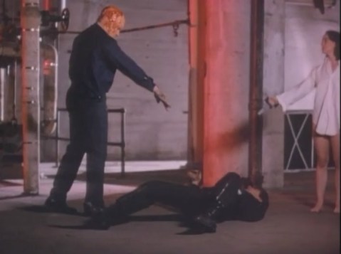 While being chased under laser pistol fire she runs on foot—fortuitously nearby around the corner of the same building by the timing of it—and catches him in bed with a pleasure droid (LeeAnne Baker of Galactic Gigolo) who, despite having about one topless line, manages to have the command performance of the movie before sleeping through a fight and then being dropped out the third floor window by a nutty Delta-7 as Riker goes all Showdown in Little Tokyo in his tightie-whities Lundgren-style with his sai.