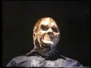 Okay, so Darla is taking a shower in… I don’t know, some arbitrary space this movie takes place in somewhere. Outside, by which I mean apparently simultaneously both directly outside the shower and still in the bathroom in Riker’s third floor apartment yet also outside on the sidewalk (first floor), we have a crazed mutant cyborg coming back to life (errr—function)… somehow or other. He has a face like a month-old calzone and he’s harder to listen to than Robin Williams moping his way through Bicentennial Man.