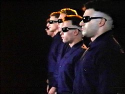 Anyway, this unconvincing jackwagon looks like he ripped the upholstery out a Dolorian and wore it as a suit while leading a cadre of “cyborgs” with sunglasses, Devo haircuts and jumpsuits stolen from Janet Jackson’s Rhythm Nation. These cyborgs—which I would consider androids—shoot laser guns, speak like total tools, and short circuit easily. Called Delta-7s, three of them malfunction and kill three others. Why these three defected units acted as a WWF tag team against the others rather than attacking everything indiscriminately is completely beyond me.