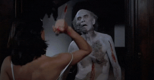 Allison starts seeing more things. Her visions correspond to a long dead murderess’ actions and the phantom tenants of her hallucinations are long dead murderers, too. Who does Allison see in her next visions but her dead dad and now-zombified whores. She cuts off his nose and pops his eyeball like a giant zit. Finally, some entertaining culty gore!