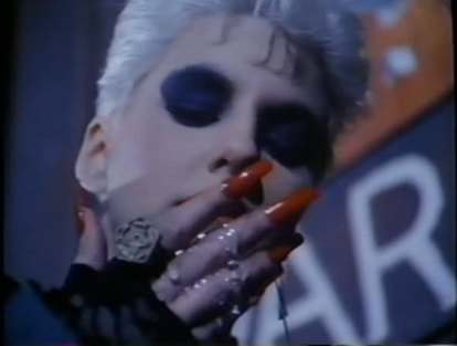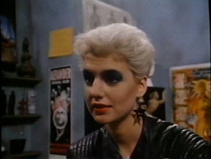 Fast forward to present day New York City and she has a motorcycle, much shorter hair, the same slutty 80s dance moves, and just as much slutty eye make-up. She stops by her local dark arts store and uses telepathy to strong arm the owner into giving her “the Devil’s ring.” When he doesn’t offer it up she “telepathies” him to death. It’s terrible. Then she uses some suggestive ESP/mind control to make some descendent of the crucifix-stabbing reverend look bad. In fact, she encounters reincarnations of everyone in the 1686 mob—all evidently reincarnated at the same time (i.e., 300 years after their “first” birth).