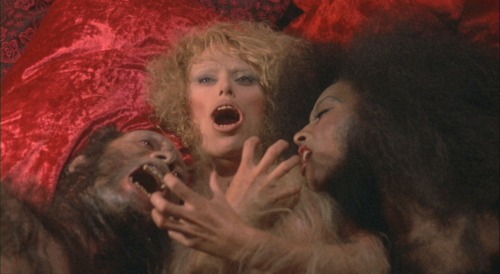 The special effects are all over the place, but always subpar and hilarious–compared to The Howling anyway.  We see werewolves that look like tall, angry leprechauns, others like sasquatches, rabid orangutans or Neanderthals and a few that actually look like a wolf-man hybrid. But, like The Howling, they keep shit classy with some mid-coitus transformation action–a threesome actually. Stirba, Mariana and Vlad (Judd Omen; Dune, C.H.U.D. II Bud the Chud) basically twitch and hiss like zombies as they get hairier and hairier while laying naked next to and/or on top of one another.  You know, classy!
