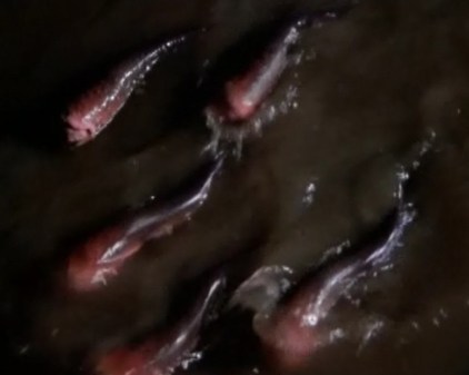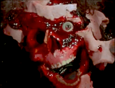 Much as in The Blob (1988) or Alien Predators (1985), a meteor (or…something…whatever) lands on Earth and brings with it horrible amorphous agents of gory death. Before we have any notion of a story we see a little of our anthropophagous extraterrestrials. They look like giant multi-headed worm Muppets loaded with teeth and two googly stalked claws. This abomination’s numerous larvae, which have infested the basement of a New Jersey home, are like little tadpole Alien chestbursters. Really kind of cute.