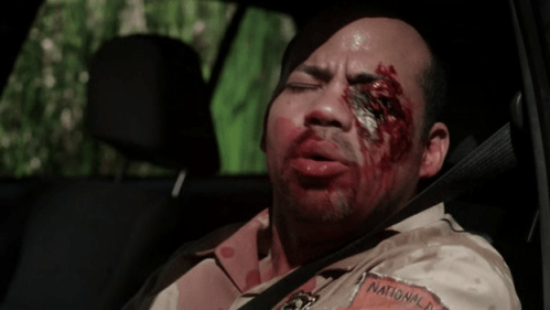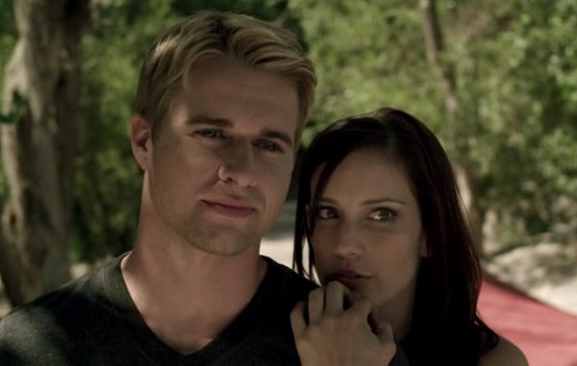 Skip to present day. Jerry (Scream Queen Katrina Bowden; Piranha 3DD, Tucker and Dale vs Evil), Kyle, Heath, Tony, Samantha, Johnny (Randy Wayne; Terror Toons 2, Caretaker) and Natasha (Erin Marie Hogan; The Theater Bizarre) load up an SUV and go off on a trip. They all put their cell phones in the locked glove compartment of the car in what I find to be a very convenient horror ploy to keep them from calling for help later. This would simply not happen. No group of seven, social, good-looking 20-somethings would ever do this voluntarily. No way! How else can they Tweet, Instagram or Facebook about it? [That’s Strike 2]