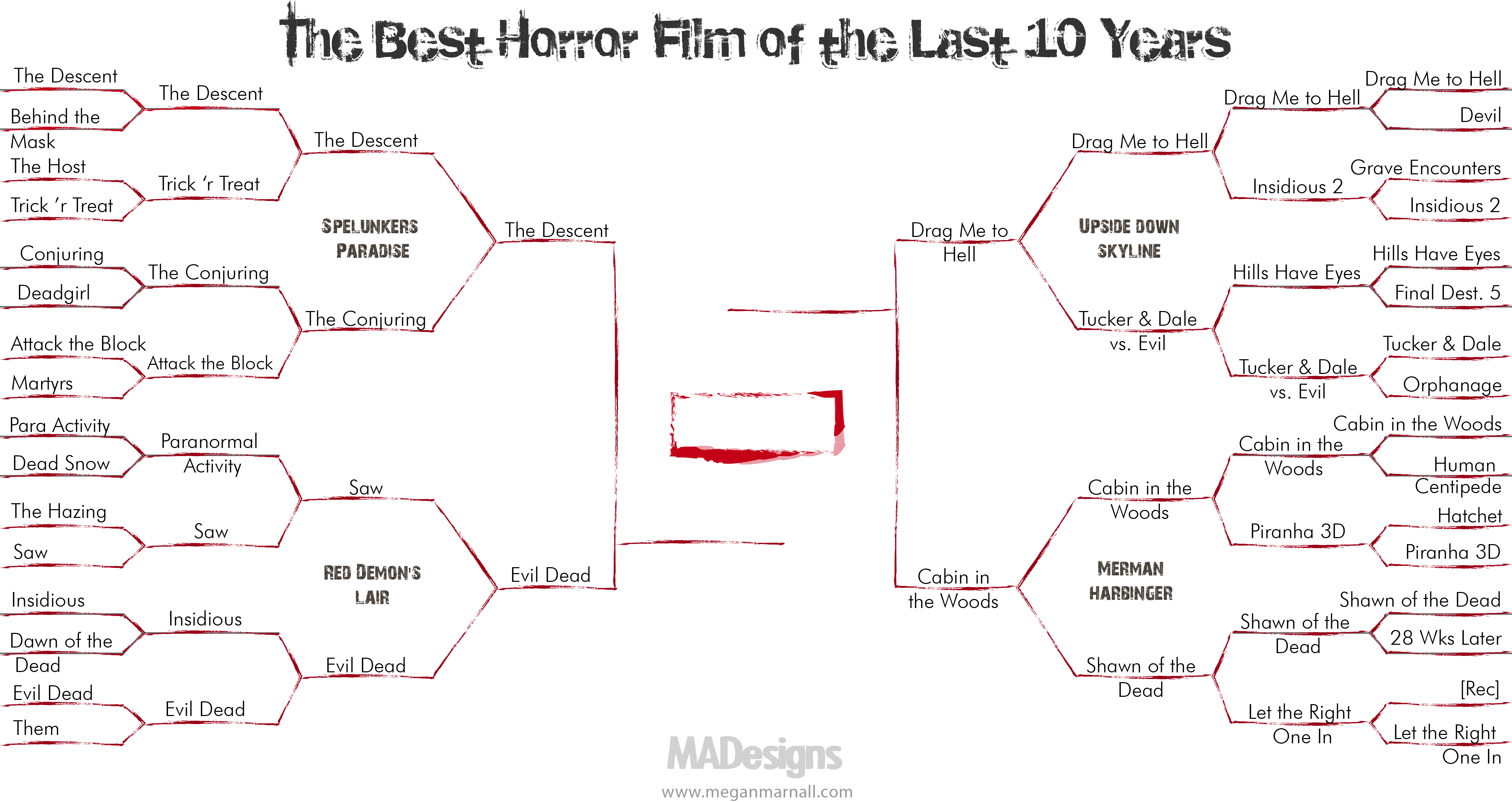 It started with 32 and now we are down to four. The Descent, Evil Dead, Drag Me To Hell and Cabin in the Woods are vying for the mythical number one spot. Will the evil Cinderella (Spiderella?) run of Evil Dead continue? Will the women of The Descent continue to spelunk deeper into the tournament? Can Cabin in the Woods fend off Mrs. Ganush and her Lamia? Will this goat get a stand alone movie?