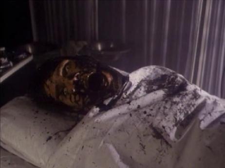 But have no fear.  This rubber-suited menace (clearly designed to resemble H. R. Giger’s xenomorph) is injected with some sort of protein antidote.  But does that save the day?  Not quite.  It posthumously gives birth to something hybridizing a chestburster and an evil human fetus!  It looks like one of the failed experiments from Alien Resurrection (1997).