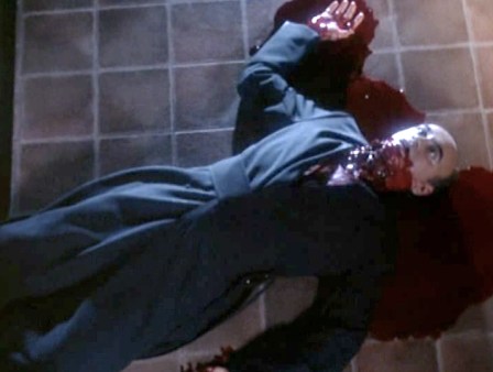 The tone for this classy flick is set in the opening scene as a redhead in a completely transparent negligee seduces a Catholic priest mid-prayer. This had me very worried that I was in for a smutty horror movie. Thankfully, after a quick kiss (probably denoting the priest succumbing to temptation), she slashes his throat and leaves a gore-slathered gash that made the horrorhound in me gleefully “SQUEEEE” with joy.