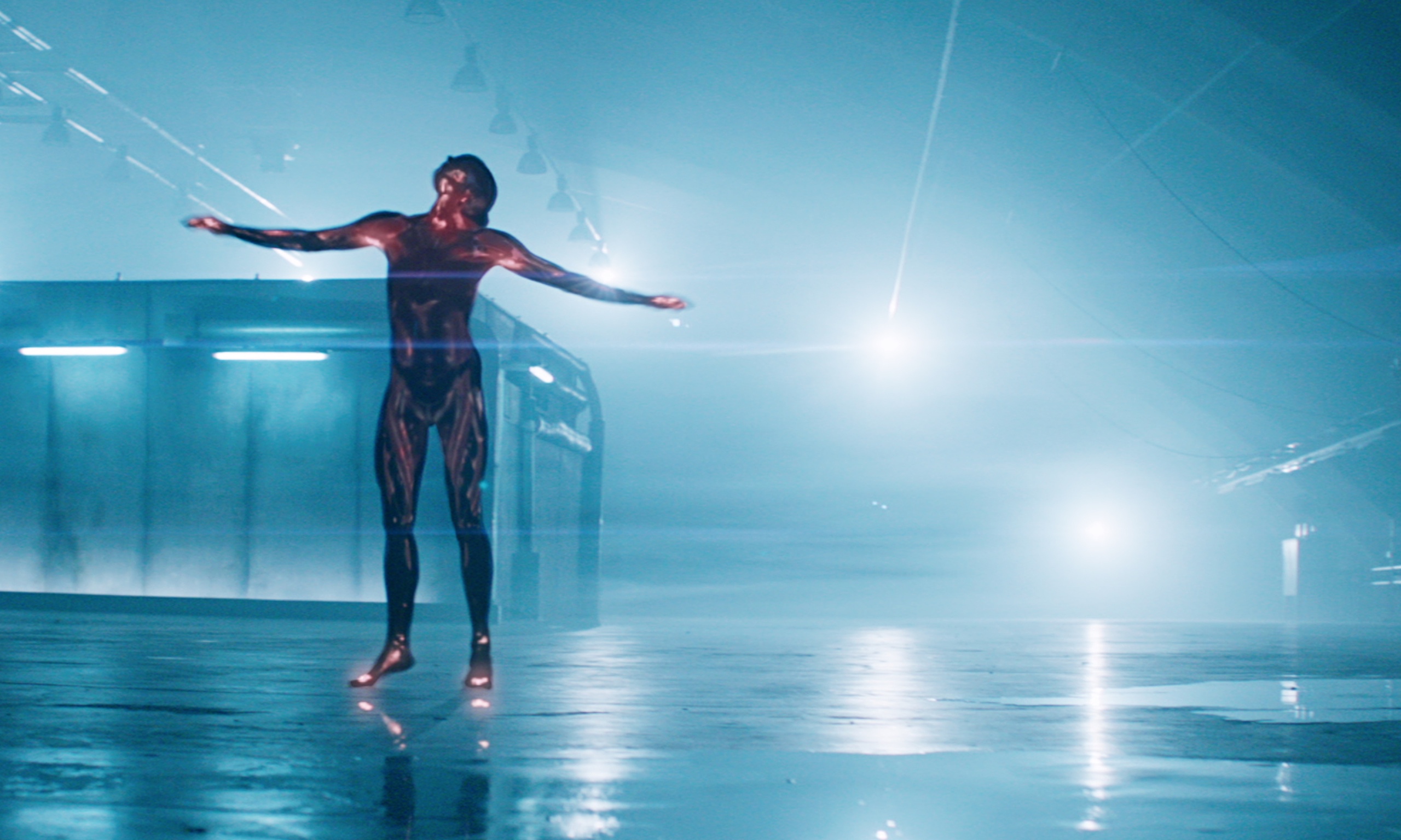 When the action begins (towards the end), Caity Lotz convincingly moves with robotic precision in brilliant contrast to an elegant and tastefully shadowed nude dance scene humanizing her early in her development. The action is nothing special, but it’s every bit as good as it needs to be to keep our attention–with a few brutally cold, robotic, and entertaining moments.