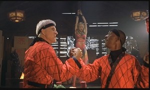 The scene is humorously well-scored (“Kung Fu Fighting”) and deliciously funny. From the very start, Eddie Murphy’s seemingly terrified death screech harbingers only good things to come. Things like Murphy’s spastic yet rigid (and terrified) technique, old school kung fu theater sound effects, kicking someone from five feet away, his enemies in a tornado of flipping themselves into unconsciousness around him as he cowers, and an homage to Bruce Lee’s classic head stomp.