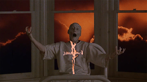 The dialogue is highly intellectualized and well-versed. If ever there was an 80s horror movie for academics, this is it. Eddie engages in deep reverie regarding the inflexive oneness of Buddhism, resurrection and the self. Obsessed with proving his hypotheses linking our personal biological matter to the ancient past and, primordially speaking, “the beginning,” he sheds himself of all distractions…even his wife and children.