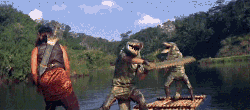 Yes. This is the right kind of horrible! Lasers, Crocodile warriors, martial arts, an undead boatman, clothes-on sex in fire, Cyclops monsters made out of papier-mâché… LOL