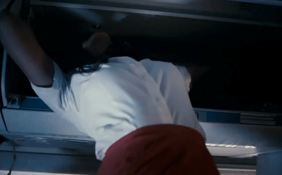 Among the passengers is a man with an old wooden box of which he’s suspiciously protective. I’d be a bit clingy to my carry-on, too, if it had an evil Japanese spirit in it (or so I’m assuming that of the contents). Shortly after takeoff he dies from a most violently protracted seizure. By the end of the movie you will find no link to this completely unnatural seizure and any of the other events that shall transpire.