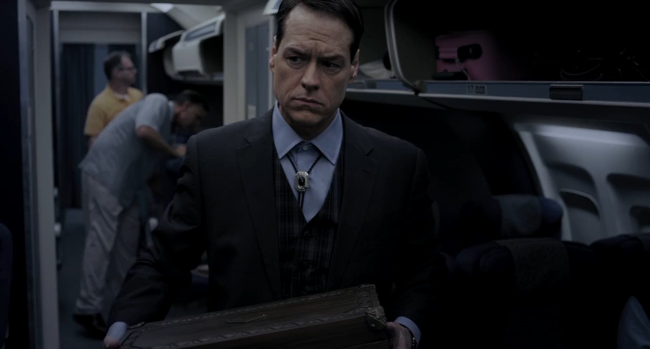 With a dead body on board people are harrowed, some even curious, but most reflecting on their lives having recently faced death. It disappoints me to say that as some strange things start happening on the plane, I found more satisfaction from the development of the characters’ relationships and self-discovery (not that there’s anything special going on) than I did the horror story itself. The formula is simple: 1) someone thinks she sees something, and 2) two passengers find connections when first they saw adversity. The dead body creepily moves, and a troubled couple reflect on their poor decisions. There’s a lot of this interplay between interpersonal moments and failed attempts at scary happenings. Speaking of failed attempts, a woman encounters a ghost emerging from the mist of the tiny airplane bathroom floor while taking a pregnancy test. Needlessly weird!