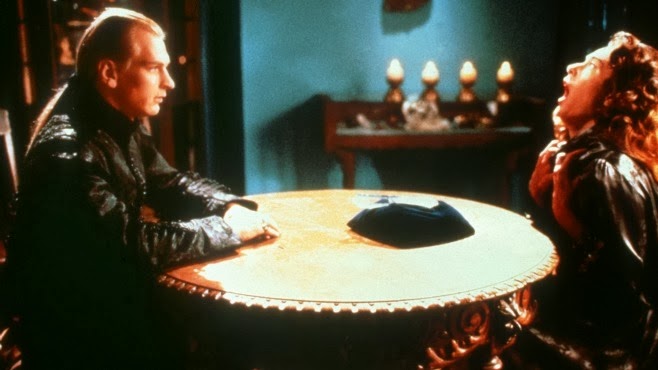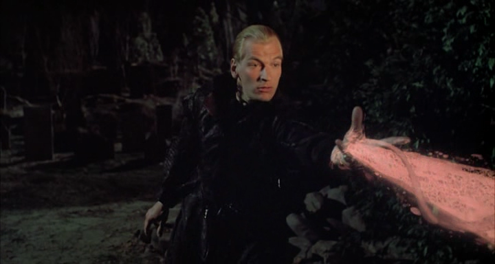 Much as with the pansexual nature of vampirism, our Warlock homoerotically kisses and bites the tongue from a gay man and spits it into a frying pan after cutting off his finger and procuring his fanciful ring. Not only a tongue and a finger, but he goes on to remove the eyes of a spiritualist (Mary Woronov; House of the Devil, Chopping Mall) which look (despite being disembodied) where he must go.