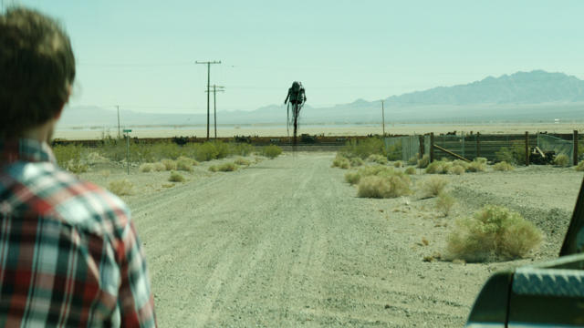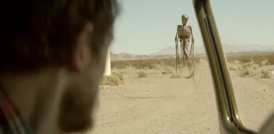 The Way In. The opening finds two men driving southbound on a desert highway. Covered in blood, trapped in some sort of timeloop and followed by several black flying angels of death, they have clearly done something very bad. This was a really sleek and cool short. The special effects and CGI are impressive. At one point a very cool looking grim reaper reaches down a guy’s throat tearing his mouth and jaw into a macabre gaping mess.