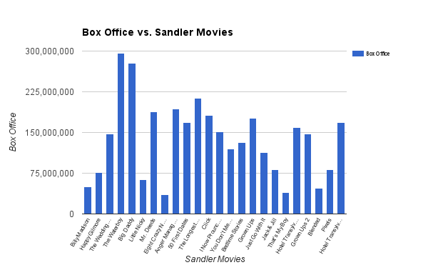 Billy Madison, Happy Gilmore, The Wedding Singer, The Waterboy, Big Daddy, Little Nicky, Mr. Deeds, Eight Crazy Nights, Anger Management, 50 First Dates, The Longest Yard, Click, I Now Pronounce You Chuck & Larry, You Don’t Mess With the Zohan, Bedtime Stories, Grown Ups, Just Go With It, Jack & Jill, That’s My Boy, Hotel Transylvania, Grown Ups 2, Blended, Pixels and Hotel Transylvania 2.