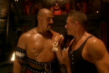 You’ll notice a lot of these opponents have been in other Van Damme movies.  It seems Van Damme keeps a stable of friends like Adam Sandler, doesn’t he?  There’s the feared Mongolian Khan (Abdel Qissi; Lionheart, The Order), who seems way bigger than 6’2” the way they present him; Phang (Jen Sung; Under Siege 2) the Siamese fighter; another boringly unimpressive Sumo wrestler (Kitao Koji; Wrestlemania VII); the mean Nazi (Habby Heske; Mr. Nice Guy); the French fighter (Takis Triggelis; Legionnaire, Savate); the ripped Turkish guy who only landed one cheap hit and went down in one stupid hit; the sensational Brazilian capoeirista (César Carneiro; Only the Strong); the big Greek guy (Stefanos Miltsakakis; Cyborg, Lionheart, Maximum Risk); the stylish Spanish fighter (Peter Malota; Double Impact, Nowhere to Run, The Order) who looks a little like Antonio Banderas; the African Zulu-esque warrior (Winston Ellis; Operation Condor); that poor Okinawan (Ong Soo Han; Kickboxer, Street Fighter); the lame Russian (Brick Bronsky; Troma movies); the Scotsman (Mike Lambert; Knock Off) who gets it in the balls; and the Chinese five-animal kung fu master (Peter Wong; Bulletproof Monk) who was AMAZING!