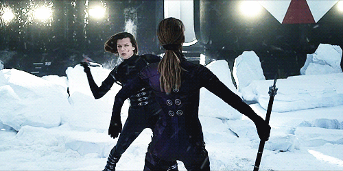 The theme of the movie is “Evil Goes Global.” But nothing felt particularly global about it (until the very last scene). The tone and setting was notably less effective than previous franchise installments. The global element seemed that the simulation facility has different cityscapes—which Alice goes through like video game stages, one after the other—which emulate Moscow, Tokyo, Suburbia, and so on, so that potential world power buyers could see how a virus outbreak would affect their enemy nation’s metropolises. All that these “stages” accomplished was making the franchise feel like a video game; a fault which, until the release of this installment, the franchise had successfully avoided.