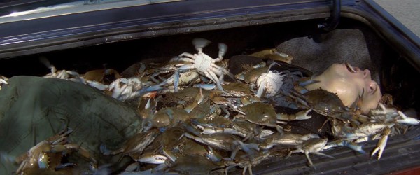 - 15 minutes – collects all of the crabs (and the few that escape), then looks around for a bit and pulls the body out of the trunk and dumps it into his vehicle.