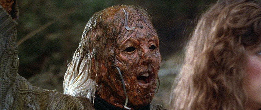 Part 2 SIDEBAR: The last movie ended as Ginny (Amy Steel; April Fool’s Day, Friday the 13th Part 2) discovered the severed head shrine to Mrs. Voorhees (Betsy Palmer; Friday the 13th Parts 1 & 2) and impersonated her to fool Jason. But after our relief from Jason’s defeat—SURPRISE! He’s still alive with a machete deeply embedded in his torso!