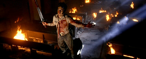 A lot happens in the end of the movie. Coopersmith flies around like a sword-wielding fallen angel, there’s blood and fire everywhere, and people are being slaughtered in a church. It’s zany. The highlights of the effects (pretty much in the last 15 minutes) were a gory ripped-out heart and all the various beheadings. A man’s head is twisted 180 degrees, another guy’s head basically explodes into gory chunks, and there are several sword decapitations. I giggled a lot—they were a delightful mess of corn syrup and latex chunks festooning the set. I giggled more at the crass campiness—a few nude scenes and a “Miss Heavy Artillery” pageant.