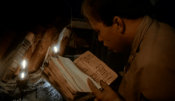 Many efforts are made to capture a dark occult atmosphere (e.g., the introductory flashbacks), but the film really only succeeds in the first cellar scene where Coopersmith encounters a cobwebbed time-forgotten library, lights about 1000 candles, leafs through cursed tomes best left untouched, and then an evil zombie fetus does…something that may or may not ever matter. But no worries, he leaves with perhaps the most infernal of the entombed books (for his own study), which haphazardly ends up in the hands of the colonel-headmaster’s secretary. This is another of many turns in the plot that goes nowhere and makes no sense.