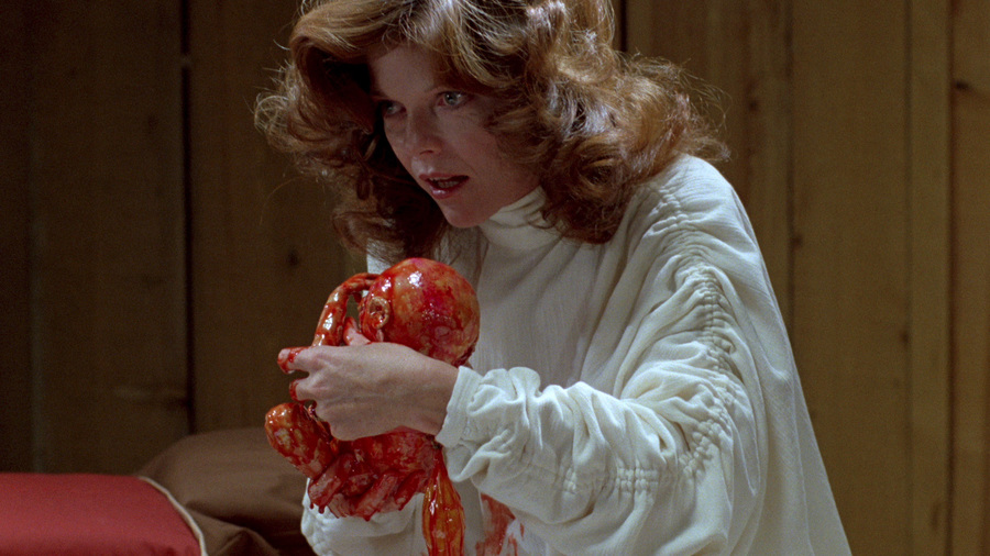 Early encounters with “the brood” are akin to evil dwarf attacks. We witness destructive mischief and malformed creatures reaching for weapons, but we don’t see the twisted little assailants.  The first encounter with these monstrous little humanoids is neither scary nor gory, and is only brutal in concept (but not so in execution).  Subsequent scenes unveil more blood along with our killers’ deformed faces.  It seems that through an unexplained treatment protocol of psychoplasmics and her resulting physiological changes, Nola has physically manifested her rage in the form of her brood.