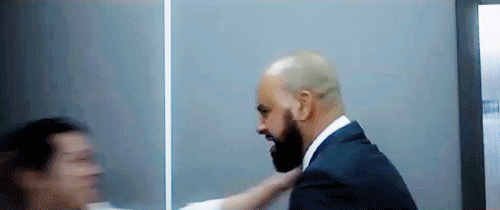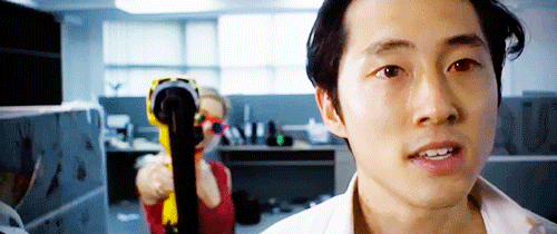 From bright-eyed and bushy-tailed to a cold suit, Derek (Steven Yuen; The Walking Dead) narrates his climb up the corporate ladder along with a brief history of this red-eye virus which leads to, you guessed it, uncontrollable murderous rage.  And guess what?  The virus sneaks its way into this cut-throat corporate office building to melt away moral boundaries and edify what remains with rage during its 8-hour life (which makes no sense at all unless everyone is a genetic clone and has the exact same immune response after being infected/exposed at the exact same time).  This odd time component creates a “Purge effect”—a time window during which mayhem is legally forgiven, and people behave accordingly to their incentives and desires.