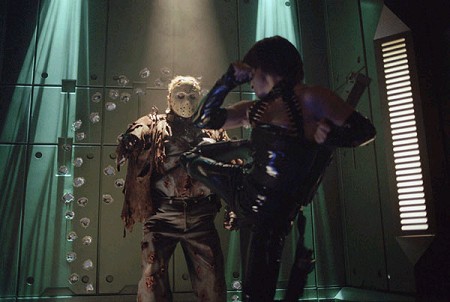 The spaceships are called the Tiamat and the Grendel (do we have some Dungeons and Dragons-mythology geeks among the writers?) and this sequel was hypersexualized (because… Dungeons and Dragons fans). There’s an S&M mid-term sex party, a scantily clad autopsy, a sexy resurrection in skimpy chainmail, sex scenes (Lexa Doig; V, The 4400, Continuum, Andromeda), and a love bot with magnetic robot nipples. Kay-Em reminds me way too much of Alice (Resident Evil; which actually came out after Jason X), all dolled up in a saucy tight black leather outfit, doing cartwheel kung fu, and playing superhuman gunfighter against Jason. But the real highlights are the liquid nitrogen head-crush kill, the crawling torso, and Jason’s second punch decapitation (since Jason Takes Manhattan).