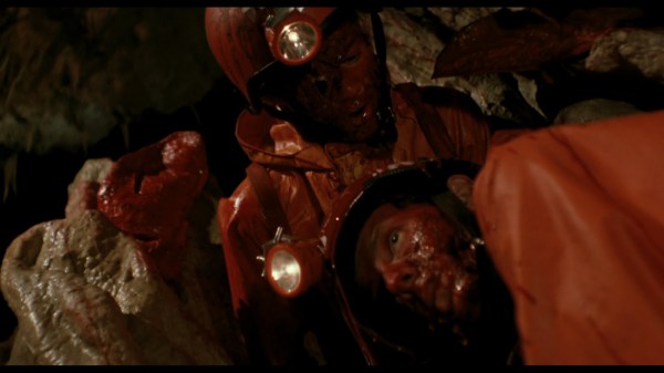 After infecting a member of our spelunking team with its “facehugger-like” stage, it then rips its way out of her face (like a chest burster). And although none of this really makes any sense, it’s a gory delight and it revels in what it accomplishes with its humble budget. My favorite part had to be the gore-slathered upside-down decapitation gag. Prime b-movie gore!