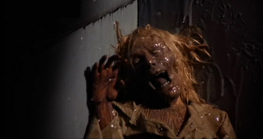 The special effects include blood spurts, dripping slime, monstrously life-drained melty corpses, gooey alien slime-molting, and some fun tentacle monster attacks that get ample screentime. Instead of a facehugger parasite, our alien has a tentacle with three claws that attacks victims’ faces, and our xenomorph’s body looks like a mucus-glazed translucent E.T. (1982) with big neotenous eyes. And like E.T., this alien can speak, has the powers of telekinesis, and just wants to go home.