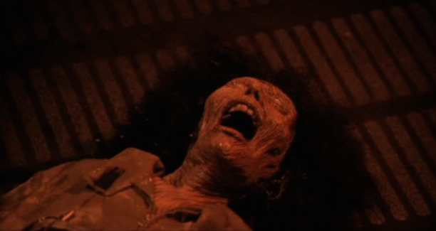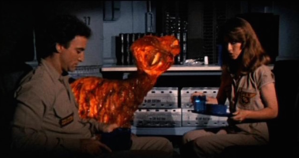 Shortly after meeting our chipmunk-sized alien, the spaceship engine shuts down and a loss of oxygen leaves the crew dead and blue-in-the-face. Two months later a subsequent crew recovers the wreckage… along with a now bigger, gooier, pulsating glowing alien thing with a bulbous body and very long tentacles (much like The Boogens (1981) or The Kindred (1987)).