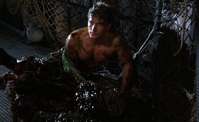 Not five minutes into the movie and a slimy insectoid and reptilian man-in-a-rubber-suit monster is skulking around Wolfgang’s (Rex Smith; Faerie Tale Theatre) spaceship only to reveal itself as a mysterious woman (Pamela Prati; Ironmaster)—appearing on his spaceship like an interstellar stripper-gram—who gets naked right away for their sex scene. But this isn’t just any cheap gratuitous nudity. No, sir! She starts to mutate mid-coitus into a beaked monster (i.e., mostly human with a few prostheses) covered in open sores. She’s like an anthropomorphized STD! Then she disappears, as if it was nothing more than a wet dream. And like a dream, that monster’s boobs will haunt us throughout the film. No, really. Flashbacks of boobs persist… like breasty PTSD.