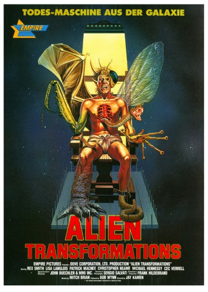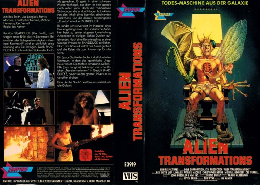MY CALL: Every bit as silly and bad as the movie poster suggests. But this honestly is a very fun B-movie with good pacing and a lot going on, including several classic SciFi callbacks/riffs. Lots of boobage–but nothing morally reprehensible. MORE MOVIES LIKE Transformations: For films delving deeper (and far more seriously) into STD horror, consider Shivers (1975), Species II (1998), Contracted (2013) or It Follows (2015). For more low budget Sci-Horror, check out the following Alien/Aliens rip-offs: Contamination (1980; aka Alien Contamination), Alien 2: On Earth (1980), Scared to Death (1980), Galaxy of Terror (1981), Forbidden World (1982; aka Mutant), Inseminoid (1982; aka Horror Planet), Parasite (1982), Xtro (1983), Creature (1985; aka Titan Find), Star Crystal (1986), Creepazoids (1987), Blue Monkey (1987), Nightflyers (1987), Deep Space (1988), The Terror Within (1989), Shocking Dark (1989; aka Terminator 2, aka Aliennators), The Rift (1990), Xtro 2: The Second Encounter (1991), Dark Universe (1993) and Zombies: The Beginning (2007).