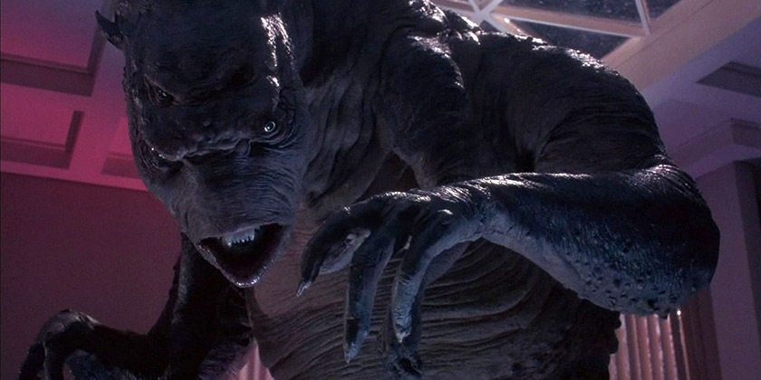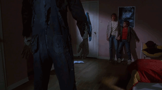 This classic begins in a dream sequence with more weird stuff to come. Among the creepy gags are Terry’s visions of his dead mother, something moving behind the walls of the house, the dead dog in the bed, the monstrous hands reaching out from under the bed, the gooey-faced parent doppelgangers, awesome-looking miniature demons, a weird phone call and its melting phone, macabre mockeries of family photos, more creepy interactions with mini-demons, the man in the wall scene (which was admittedly way scarier when I was a kid), bloody writing on the walls, the eye on the hand, and yet even more tiny demon shenanigans. The greatest effect had to be the stop-motion/claymation giant demon (i.e., the Old God). I loved the way it moved and its odd morphology (i.e., several sets of eyes, limbs, tentacles).
