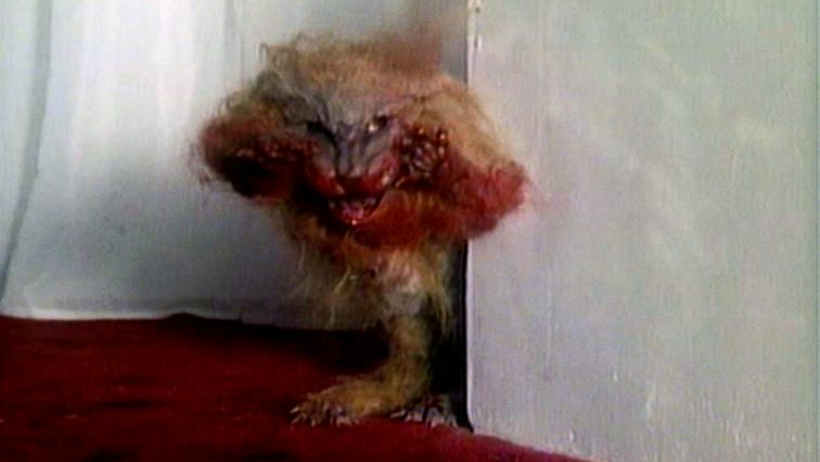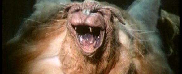 We come to learn that this cat has been genetically engineered and that it has toxic saliva. I’m a bit confused as to how this cat transformation works. I’m beginning to think the little cat comes out of its mouth and flips the cat inside-out into monster-cat—which almost looks like a monster from Ghoulies (1985). But then later we actually see the little demon cat completely outside of the limp husk of a regular cat… so is the regular cat like a disguise it wears? And when the little one emerges, it then grows even bigger than the original cat suit only to shrink back down when it re-enters the cat suit? None of this makes any sense. BUT… it is fun to watch!