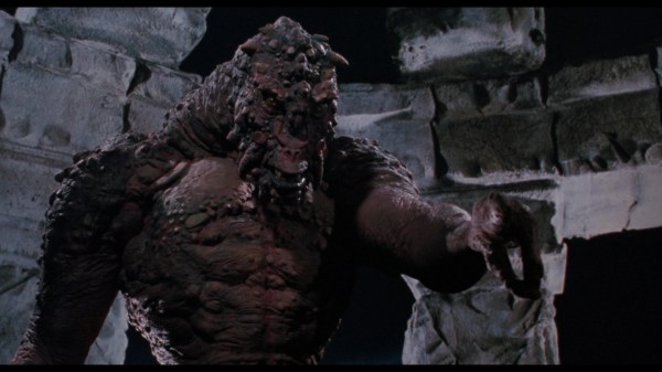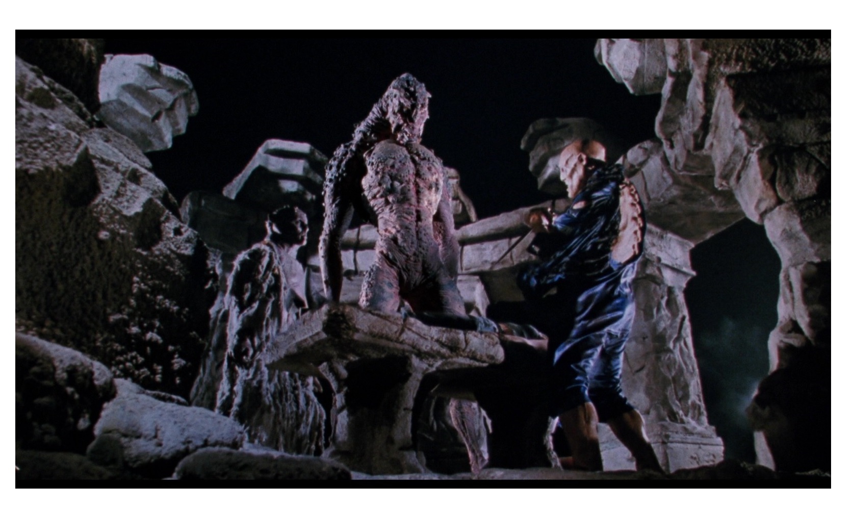 Besides the gooey effects, we enjoy a lot of the tiny minion demon and some stop-motion animation for the fully transformed John-demon. We actually end up with more than one man-sized demon, the effects of which are mixed from “okay” to pretty good with one stop-motion demon, one body suit monster effect, and one latex and prosthetics. It’s a nice mix of effects. The Other Side—likely named after Poltergeist II (1986) and conceptually designed considering Phantasm I-II (1982, 1986)—offers a neat other-worldly altar for the final confrontation.