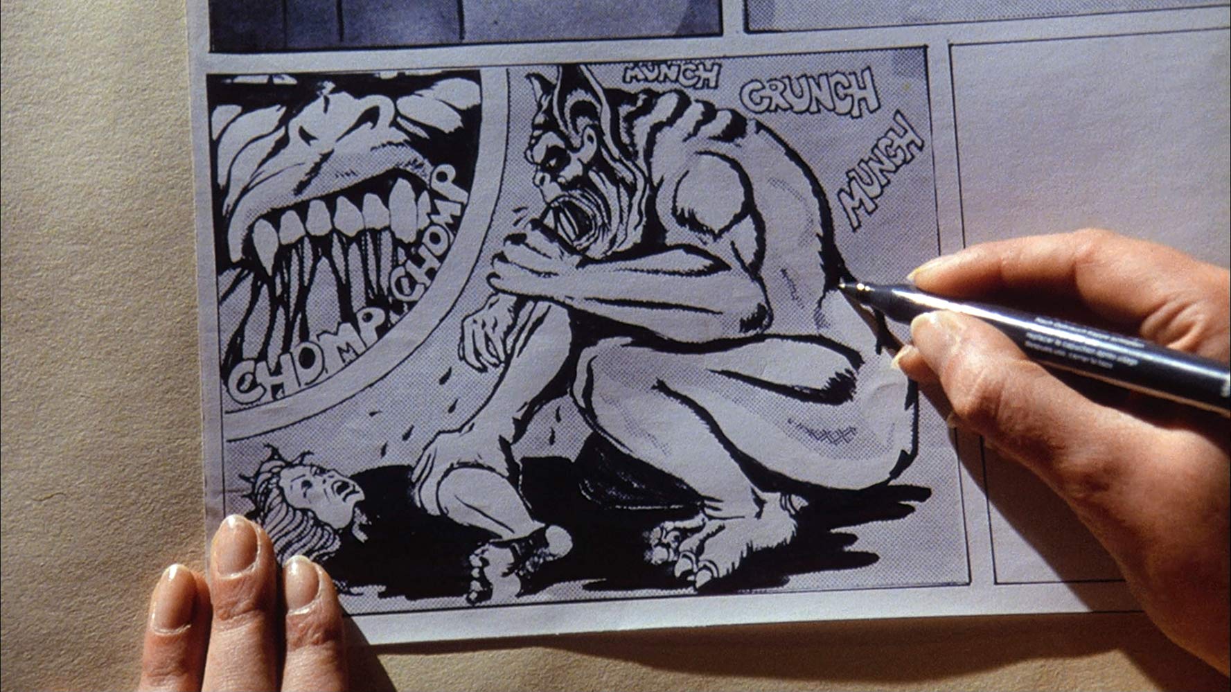 The gore is effective and quite ambitious for its budget. But this movie’s victory is in the creature costume and latex work. I love seeing its face with its blinking eyes and twitching ears as it eats a victim’s severed foot, tearing the flesh from the bone and the decapitation scene packs a gleeful momentary goriness. Meanwhile, the interplay between the comic strip panels and their murderous realization on-screen was more fun than I’d imagined.