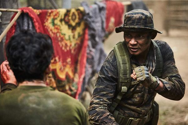 Our first real martial arts exchange is between Tony Jaa and Iko Iwais. It was very brief, but with it I found great comfort in the action photography, the (perhaps complete) lack of wirework and unchoppy editing. When we later find our mercenaries in a local Asian fighting arena making some quick cash, we get a better taste of the action-style of this film, which is highly practical and makes no superheroes of its martial artists. At times you may miss the Tasmanian Devil-like whirlwinds of somersaults, corkscrew flairs, 20-foot leaps, aerial cartwheels and jump spin 720 hook kicks. But this movie makes these men appear a more credibly outstanding. So you’ll be very entertained. You just won’t be screaming at the screen like you were when you watched The Night Comes for Us (2018), The Raid: Redemption (2011) , The Raid 2 (2014) or Kill Zone 2 (2015).
